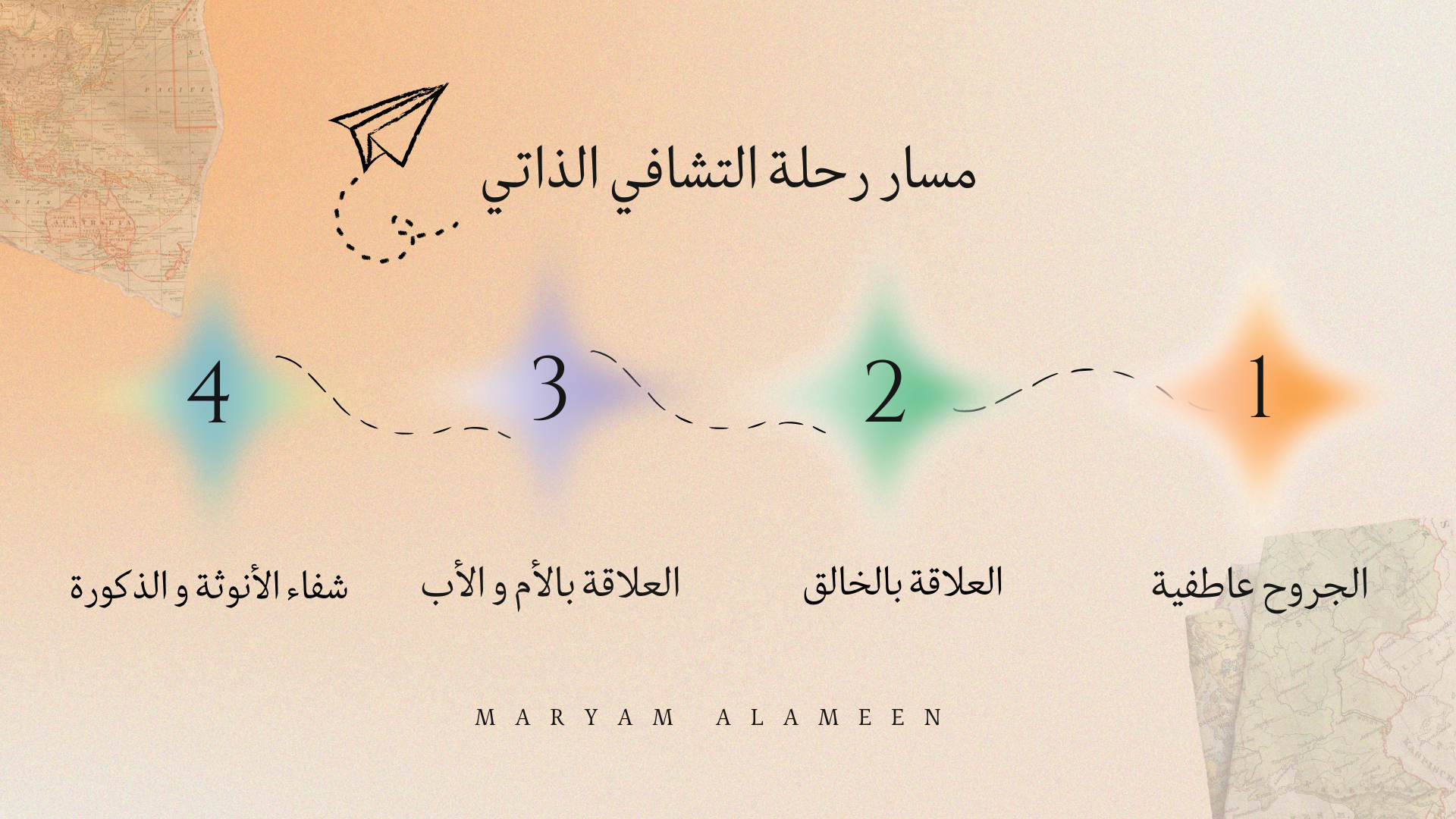 البدء بالجروح العاطفية يليها العلاقة بالخالق ثم العلاقة بالأم و الأب ثم الإنتقال لشفاء الأنوثة و الذكورة و العلاقة بالجسد